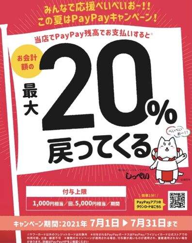2021年7月、磐田市でPayPay還元キャンペーン! なんと、対象のお店でPayPayで支払うと20パーセント戻ってきます! 1000円の定食頼んだら、200円分のポイントが貰えます。 つまり、実質2割引きってことです!こりゃお得! 以前、浜松とかでやってたキャンペー…